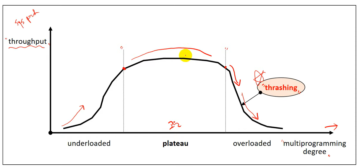 시스템의 부하가 너무 적으면(under-loaded) 자원을 낭비하는것으로 성능의 저하를 말하고 부하가 과하면(Over-loaded) 자원에 대한 경쟁이 심화되고 과도한 page fault가 발생하는 thrashing 현상이 발생 하여 성능이 급격히 저하된다.